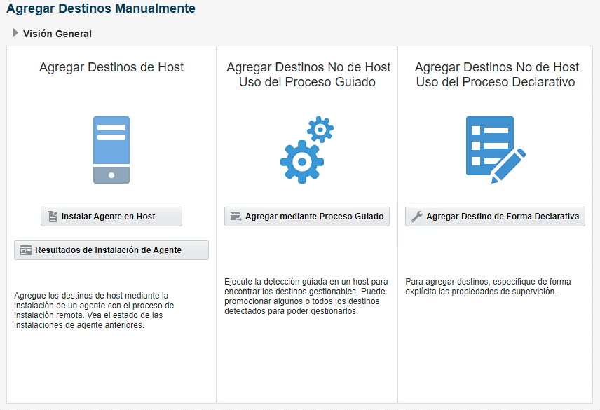 Ahora que todas las comprobaciones previas están realizadas, pasaremos a lanzar la instalación de los clientes desde la propia consola del OEM. Para ello, en el menú superior nos dirigimos a: Configurar > Agregar destino > Agregar destinos manualmente. Esto, nos llevará a la siguiente pantalla: