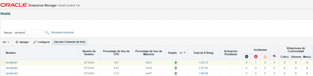 Ahora que ya tenemos el agente instalado en los clientes ya los podremos monitorizar desde el OEM. Si nos dirigimos a Destinos > Hosts podremos usar el buscador para encontrar nuestros nodos: