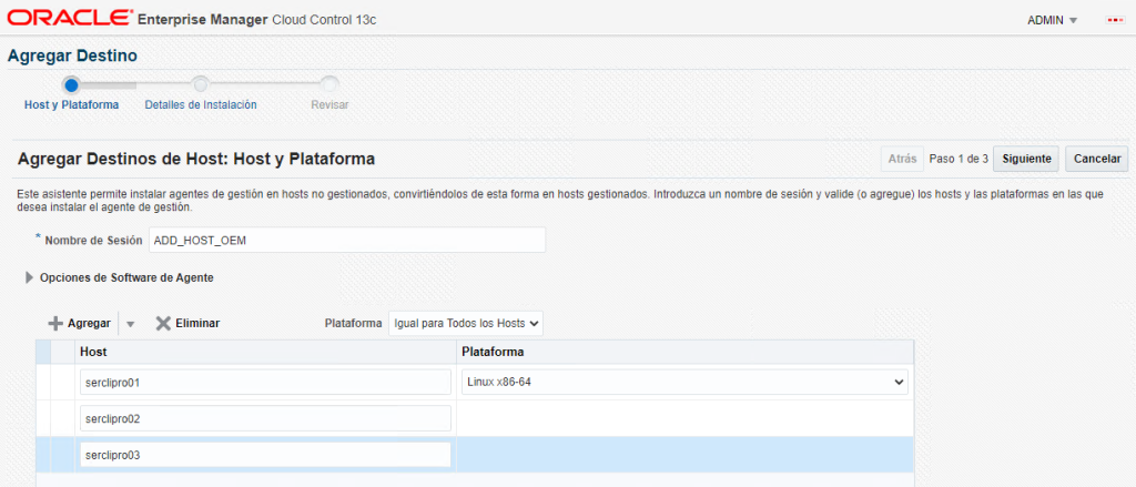 En esta primera pantalla, podremos darle un nombre a la sesión de instalación si lo deseamos o dejar la que se asigne por defecto, además de agregar los tres hosts que nos ocupan en nuestro caso. Además, deberemos indicar la plataforma de instalación para estos clientes, que puede ser la misma o diferente en cada caso.