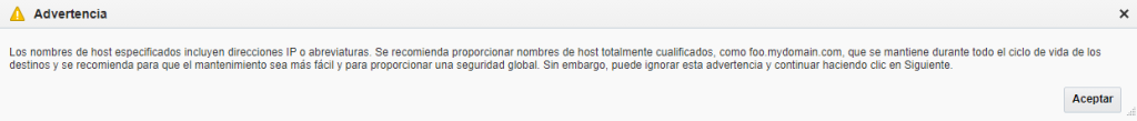 Este nos dice que lo ideal es proporcionar el nombre de los hosts como FQDN, pero que podemos obviar el mensaje y continuar. Así que, como somos obedientes, le damos a Aceptar. Esto nos lleva a la segunda parte del asistente: