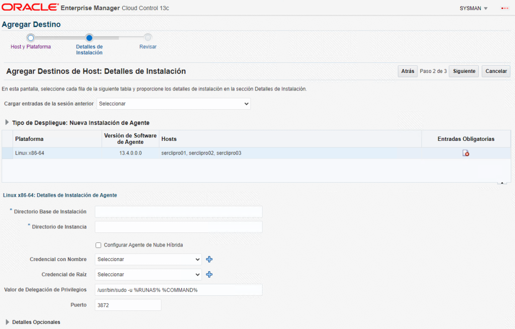 En esta pantalla, vamos a rellenar los campos Directorio Base de Instalación y Credencial con nombre. El primero es sencillo, introducimos la ruta que creamos antes en el FS de instalación: /oem_oracle/cloud. Verás que el campo Directorio de Instancia se rellena automáticamente.