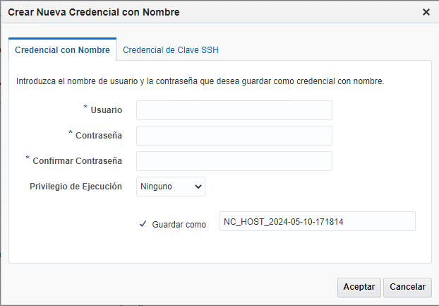 Para rellenar el campo Credencial con Nombre, debemos pulsar en el símbolo de + que tenemos a la derecha, a no ser que tengamos unas credenciales previamente guardadas y que sirvan para esta nueva instalación. Esto nos abre la siguiente ventana: