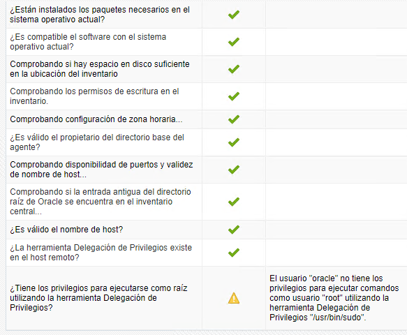 A lo próximo que debemos prestar atención es cuando el instalador esté en el paso «Comprobación de requisitos remotos», ya que nos comunicará que el usuario que hemos proporcionado (oracle) no tiene permisos para hacer sudo y ejecutar scripts como root: