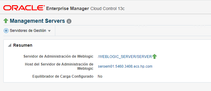 Ahora, necesitas conectarte a la máquina donde tengas el OEM instalado y navegar por el menú superior a Configurar > Gestionar Cloud Control > Servidores de Gestión. Ahí, encontrarás el FQDN del servidor Weblogic: